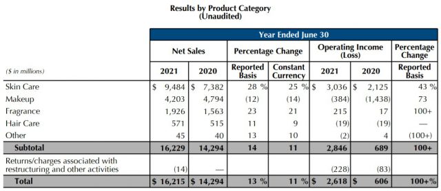 Su portafolio de Fragancias, compuesta por diversas etiquetas internacionales como DKNY, Michael Kors y Aerin, subió 21% a u$s 1.926 millones. En cambio, los ingresos en Makeup cayeron -14% a u$s 4.203 millones. Por otra parte, Hair Care también ascendió 9% a u$s 571 millones.