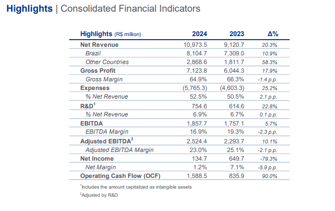 Con todo, los ingresos de operaciones en Brasil fueron de R$ 8.104,7 millones (u$s 1.412 millones), con una variación del 10,9% interanual. Por su parte, la facturación proveniente de las operaciones internacionales creció un 58,3% en 2024 a R$ 2.868,6 millones (u$s 500 millones). A nivel local, la compañía está encabezada por Pablo Angiono, aunque la Argentina no aparece mencionada en el balance.