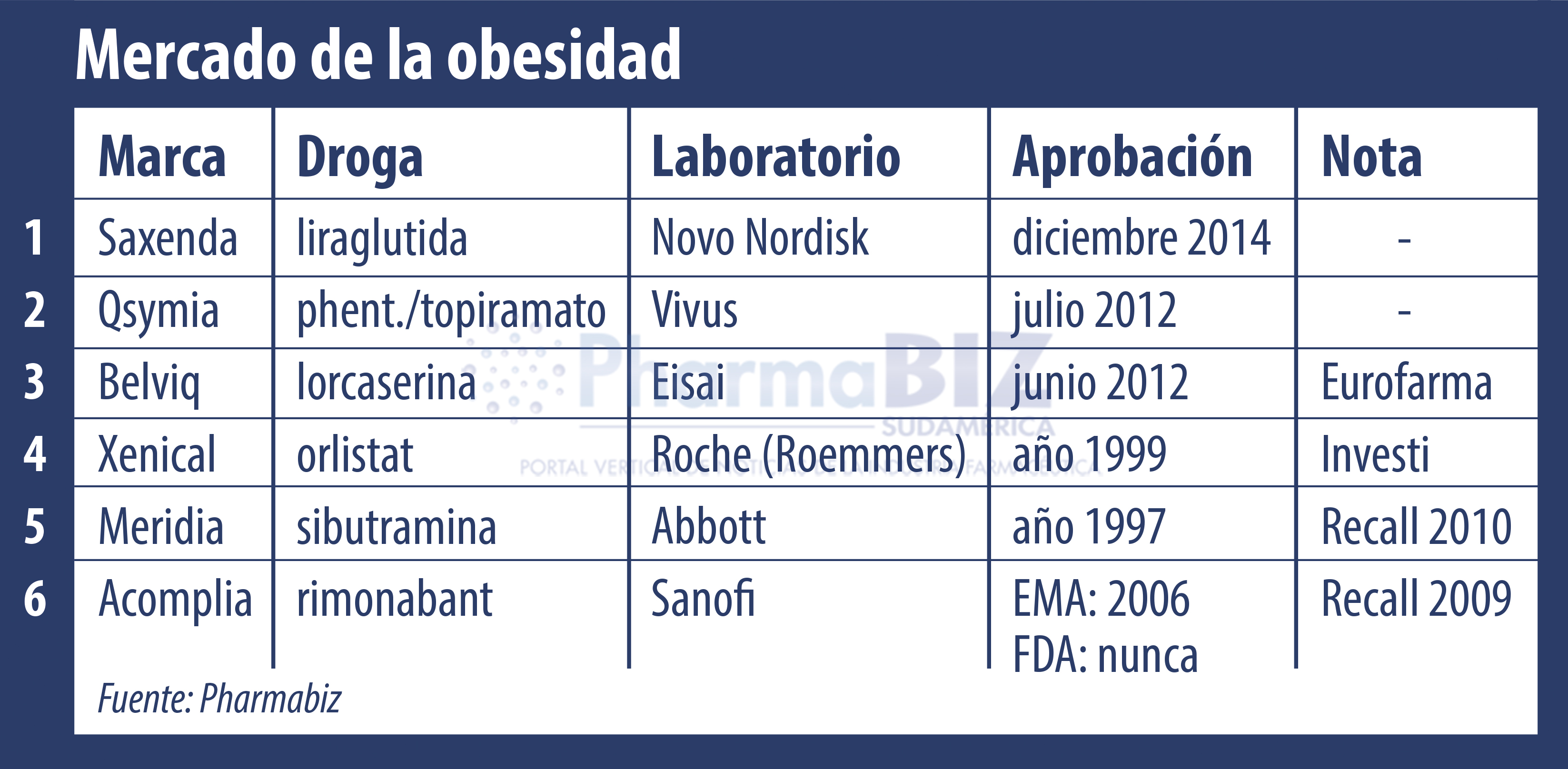 Este mercado tuvo en su momento varias bajas que impactaron, y mucho. Las autoridades regulatorias habían retirado definitivamente a la sibutramina y al rimonabant. Ambos activos fueron discontinuados entre el 2009 y el 2010 y tenían el sello de la la norteamericana Abbott y la francesa Sanofi, respectivamente. Ver artículo