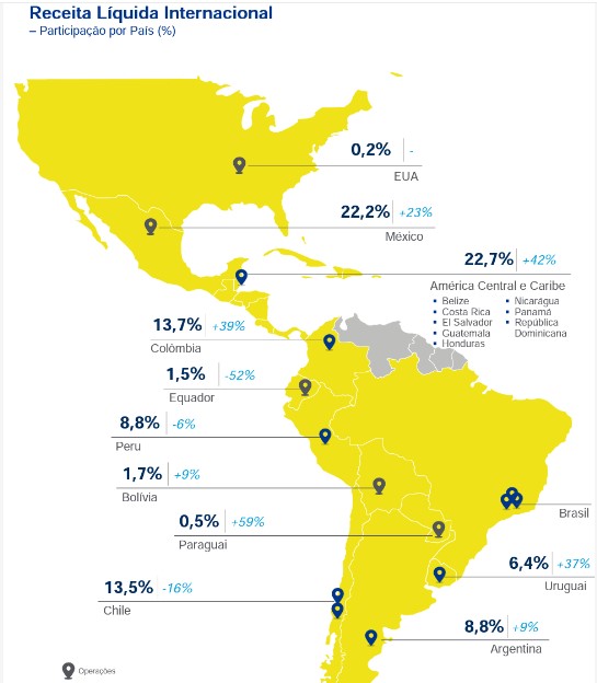 Los ingresos provenientes de las operaciones internacionales crecieron un 15% en 2022 a R$ 1.300 millones (u$s 250 millones), gracias al aporte principalmente de Centroamérica, México y Colombia. El año pasado, las ventas de las operaciones fuera de Brasil representaron el 16% de su facturación, el mismo nivel que en 2021.