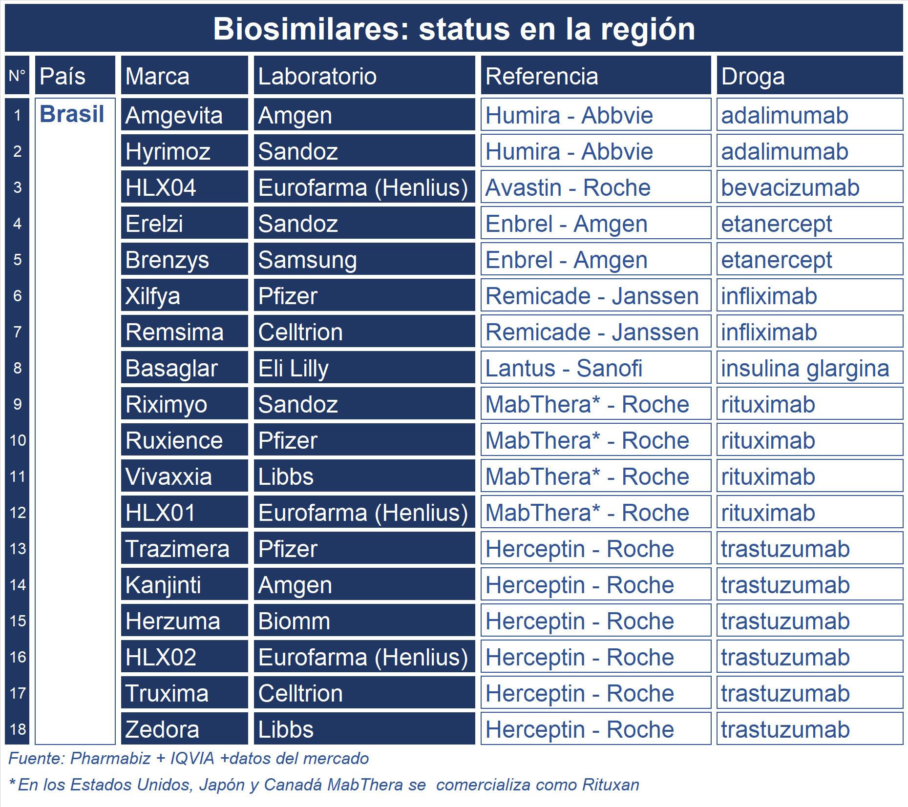 Otro de los incluidos en el deal es el rituximab, indicado para linfomas y leucemias, así como para uso en artritis reumatoide. Se trata de un biosimilar que tomaría como referencia a MabThera de Roche. Aunque en Brasil ya se comercializa Vivaxxia de Libbs, que se fabrica mediante un acuerdo con la empresa de origen argentino mAbxience y Ruxience de Pfizer. En nuestro país, los equivalentes disponibles son Novex del nacional Elea y Rixathon de la suiza Sandoz. Ver artículo Libss lanzó Vivaxxia.