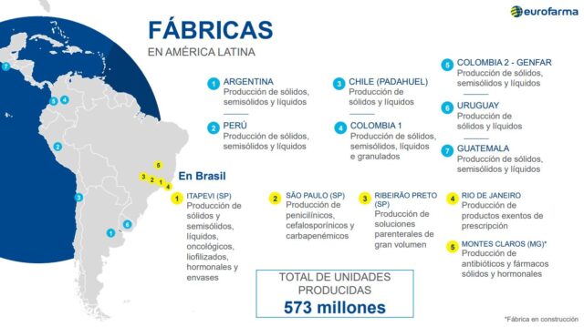 En la actualidad, Eurofarma cuenta con 12 plantas propias: 5 de ellas ubicadas en Brasil, 2 en Colombia y el resto en Argentina, Perú, Uruguay, Chile y Guatemala. Su producción global en 2023 alcanzó a la 573 millones de unidades.