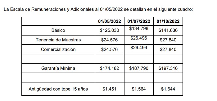 A partir de este nuevo acuerdo, que tiene vigencia retroactiva desde el domingo 1 de mayo pasado, un visitador médico percibirá un ingreso mensual mínimo de $174.182 (u$s 1.385,81). Esta cifra está conformada por un básico de $125.030 (u$s 994,75); un adicional de $24.576 (u$s 195,53) por tenencia de muestras; y otro monto equivalente en concepto de comercialización. A esto también se le adiciona un total de $1.451 (u$s 11,54) por cada año de antigüedad, con un tope de 15 años.