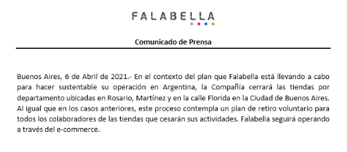 La cadena de tiendas departamentales Falabella anunció el cierre de más sucursales, en este caso las ubicadas en Rosario, Martínez y la de la calle Florida 202, en la Ciudad de Buenos Aires. La medida es parte del proceso de desinversión que encaró en septiembre de 2020. Ver artículo.