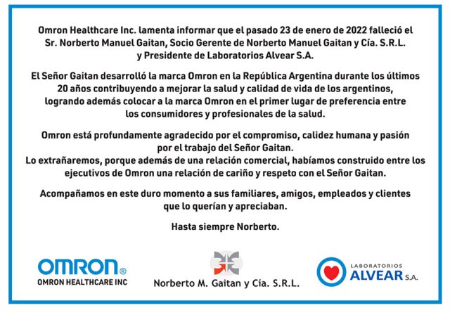 Falleció el fundador de Laboratorios Alvear, Norberto Gaitan. Se trata de la empresa argentina que por dos décadas fue la responsable de representar a los devices médicos de la japonesa Omron.