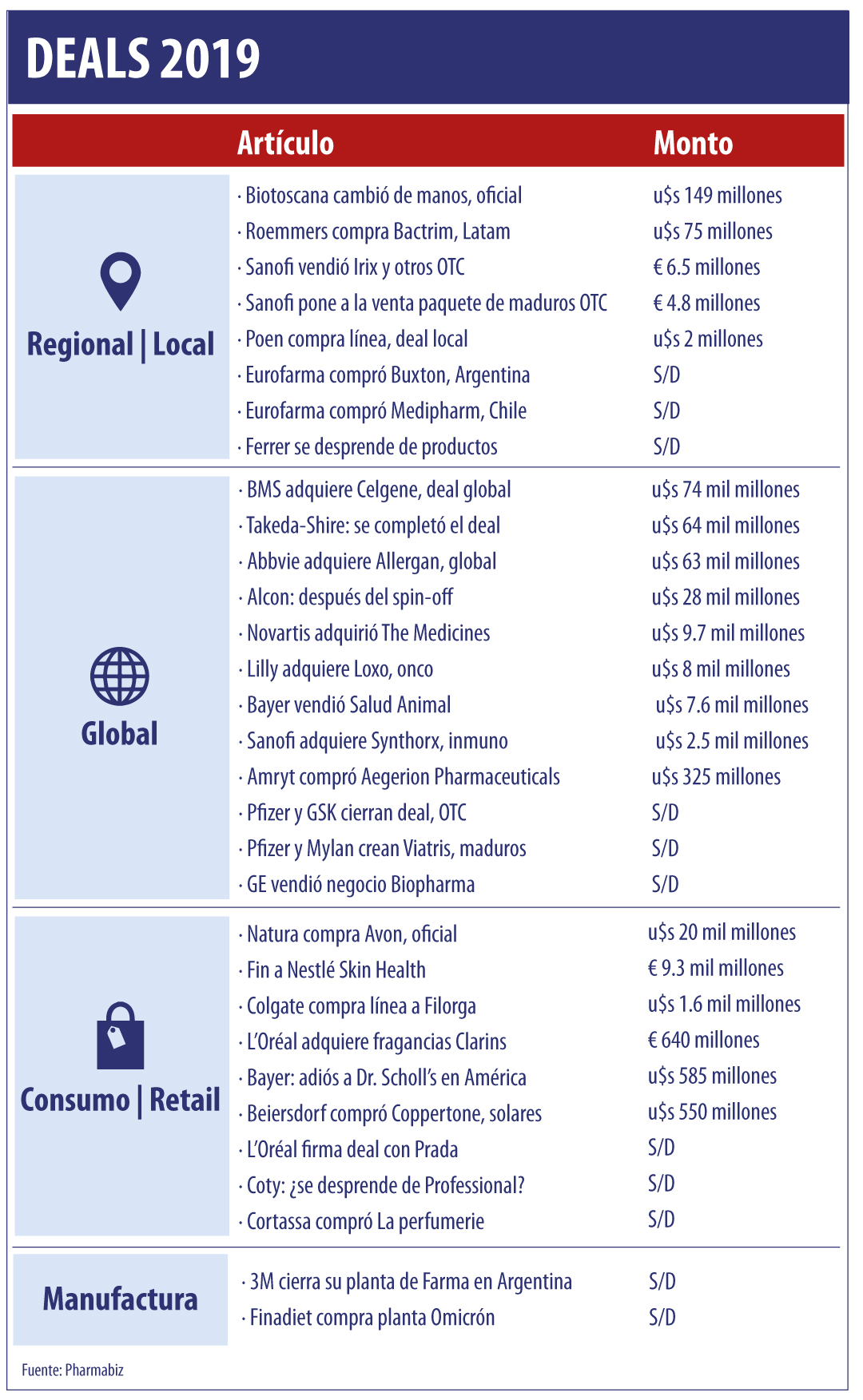 El año arrancó con el mega deal encabezado por la norteamericana BMS que se hizo de su par Celgene por un monto aproximado de u$s 74 mil millones para formar una biofarmacéutica global premier. Dicha operación superó a la sellada por Takeda en el 2018 cuando acordó comprar a la irlandesa Shire por u$s 64 mil millones, convirtiéndose en una de las cinco transacciones más resonantes de todas las industrias registradas durante dicho año. Aunque la misma se terminó de materializar recién en este 2019. Ver artículo. Ver artículo.