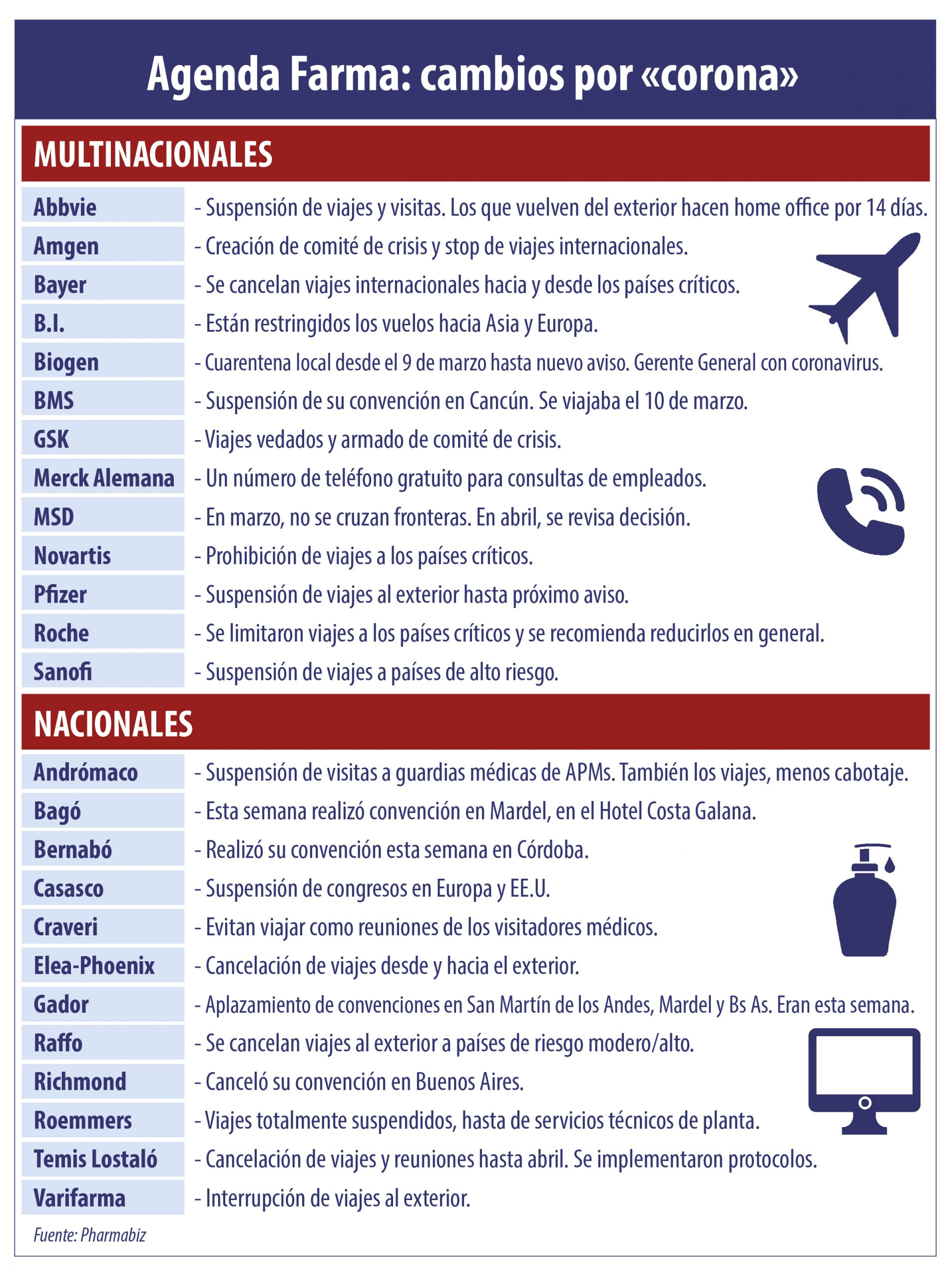 Por otro lado, el nacional Raffo prohibió desde la semana pasada cualquier viaje a países de riesgo moderado y alto como Estados Unidos y zonas de Europa. Además la firma recomendó no realizar viajes personales y en caso de hacerlo solicitó se informe a RRHH para activar la cuarentena si fuera necesario. Por otro lado la compañía determinó que los APMs no concurran a hospitales o guardias. La misma estrategia tomó Craveri que está evitando las reuniones de visitadores médicos y los viajes de ejecutivos.