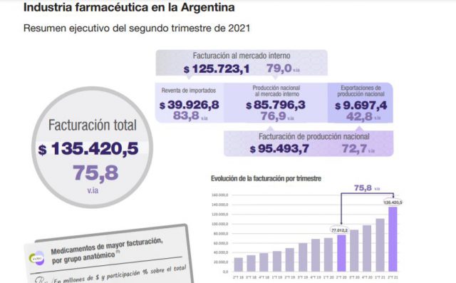 Pruebas al canto sobre las dificultades para generar ventas a los mercados externos en farma son las cifras que revela el INDEC. Según datos publicados por el instituto, durante agosto farma vendió apenas el 0,82% de lo que exporta la Argentina. Esto representa un total de u$s 67 millones. De modo que el sector está por fuera del top 20 en términos de relevancia. Además, de acuerdo al informe sectorial que el INDEC publica periódicamente, durante el segundo trimestre de 2021 la facturación de la producción nacional de la industria farmacéutica ascendió a $95.493,7 millones (u$s 909.1 millones), de los cuales $85.796,3 millones (u$s 816.7 millones), un 89,84% fueron colocados en el mercado local. En cambio, las exportaciones sumaron $9.697,4 millones (u$s 92.3 millones), un 10,16% del total. Ver informe / Ver informe.