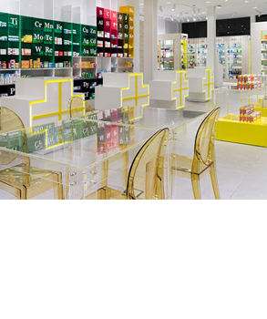 Las farmacias aggiornan su layout constantemente. Esta farmacia logró una estética sofisticada al tener la mayor parte de sus piezas hechas de acrílico de colores.
