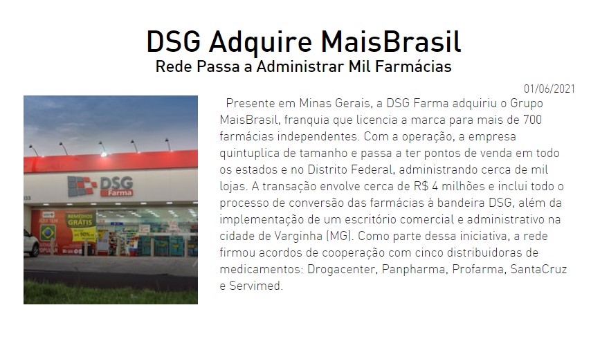 Según lo publicado por el sitio especializado en trade Giro News, la red, que opera con más de 50 puntos de venta y que está presente principalmente en el estado de Minas Gerais, adquirió al Grupo MaisBrasil, una firma que funciona con sistema de franquicias y tiene licenciadas a más de 700 farmacias independientes. Ver artículo Giro News