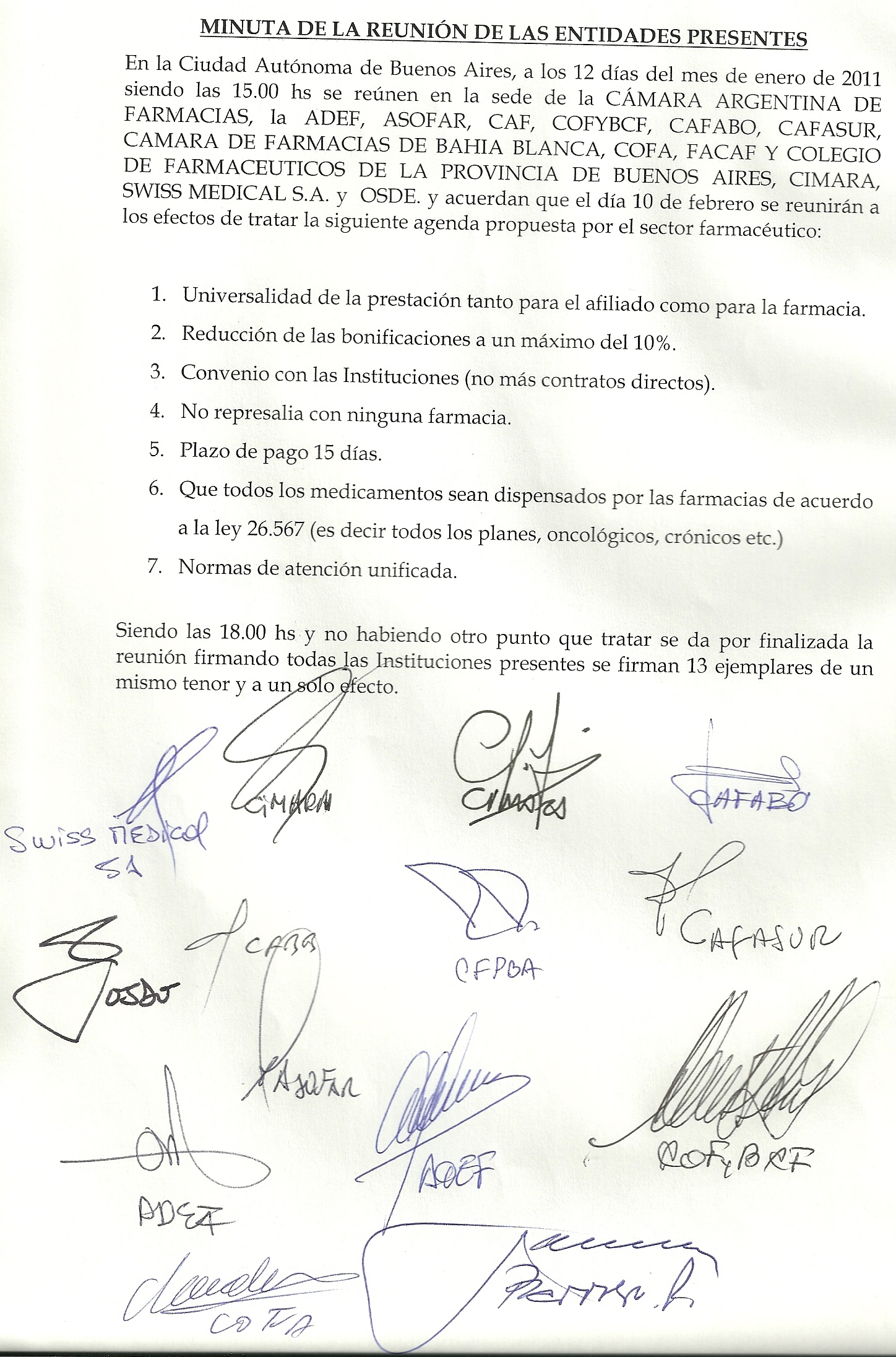 Las entidades presentes en la reunión por parte de las farmacias fueron: la Asociación de Propietarios de Farmacias (ASOFAR), la Cámara Argentina de Farmacias (CAF), el Colegio Oficial de Farmacéuticos y Bioquímicos de la Capital Federal (COFyBCF).