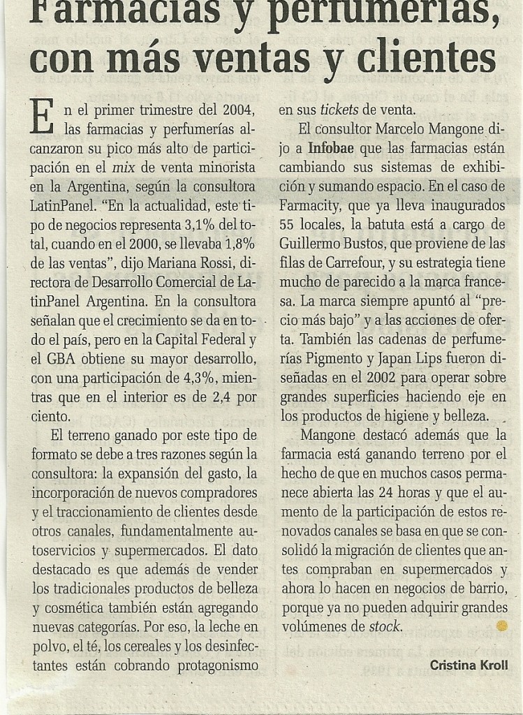 En el primer trimestre del 2004, las farmacias y perfumerías alcanzaron su pico más alto de participación en el mix de venta minorista en la Argentina, según la consultora LatinPanel. «En la actualidad, este tipo de negocios representa 3,1% del total, cuando en el 2000, se llevaba 1,8% de las ventas«, dijo Mariana Rossi, directora de Desarrollo Comercial de LatinPanel Argentina. En la consultora señalan que el crecimiento se da en todo el país, pero en la Capital Federal y el GBA obtiene su mayor desarrollo, con una participación de 4,3% mientras que en el interior es de 2,4 por ciento.