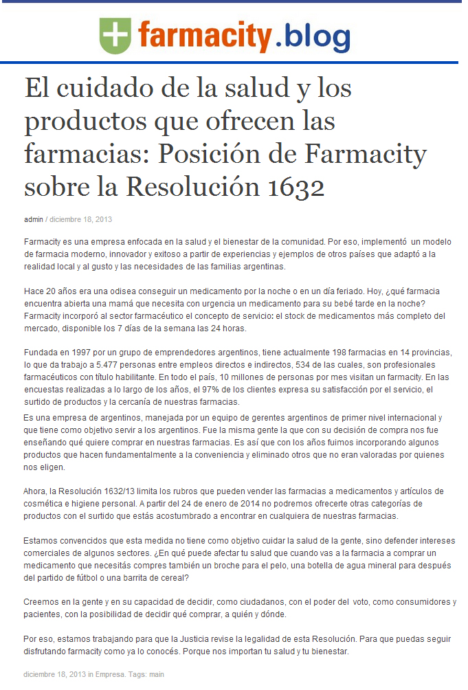 El mayor retailer de farmacias de la Argentina diseñó una pieza audiovisual para explicar la estrategia adoptada frente a la Resolución 1632, que en octubre de 2013 llevó la firma del Ministerio de Salud de la Nación. Ver artículo.