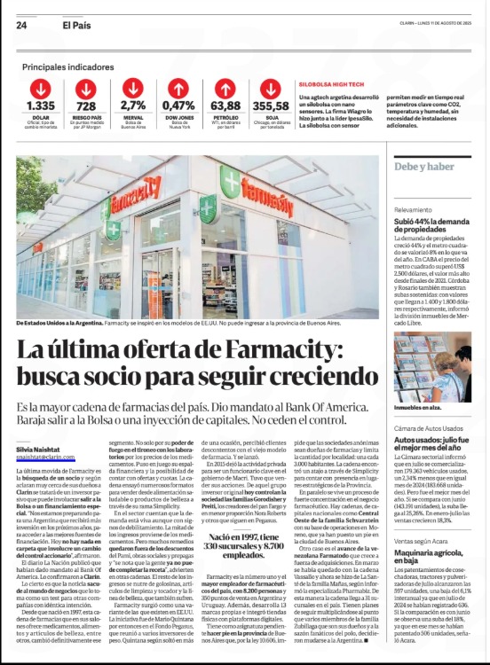 En la sección El País del diario Clarín se informó que la principal cadena de farmacias del país le extendió un mandato al Bank of America a fin de que se busque un socio inversor. Se explica que es parte de una estrategia para financiar su crecimiento. Desde Farmacity asimismo confirmaron la estrategia. Afirmaron mediante su vocería que la empresa se está preparando para acceder a las mejores fuentes de financiación, lo que puede incluir las opciones de mercado de capitales, financiamiento multilateral o la incorporación de nuevos inversores pasivos. Ver nota diario Clarín