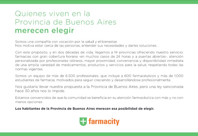 Farmacity quiere desembarcar en la provincia de Buenos Aires. Así lo salió a decir oficialmente en una solicitada que se publicó el fin de semana en los diarios masivos. Ver abajo.