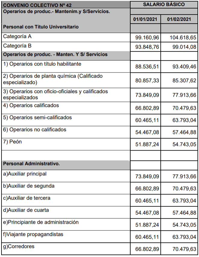 De modo que -en el marco del Convenio Colectivo de Trabajo 42/89- se definió que para el mes de febrero el personal de mayor rango en el escalafón percibirá ingresos por $104.618,65 (u$s 1.137,16). Mientras que el sueldo de un operario con título habilitante será de $93.409,46 (u$s 1.015,32); y el de un operario calificado alcanzará los $70.479,63 (u$s 766,08).
