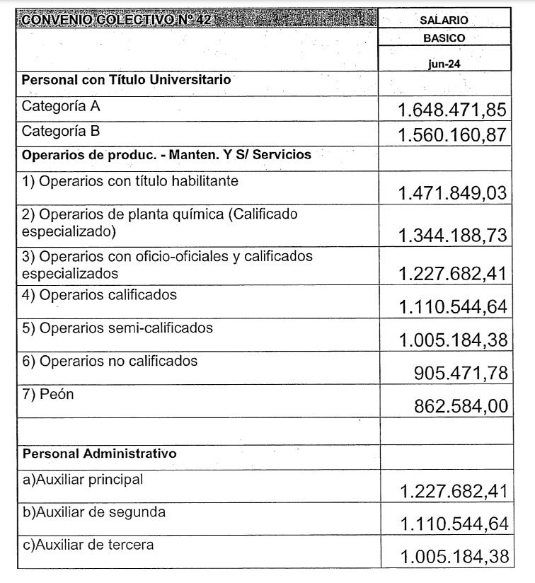 En el marco del Convenio Colectivo de Trabajo 42/89, se definió que para el personal de mayor rango en el escalafón, es decir quienes tengan título universitario categoría A, percibirán ingresos por $1.648.471,85 (u$s 1.744,54) en junio. Mientras que el sueldo de un operario con título habilitante será de $1.471.849,03 (u$s 1.557,63) para el sexto mes del año. Por su parte, un operario calificado alcanzará los $1.110.544,64 (u$s 1.175,27) por este mes.