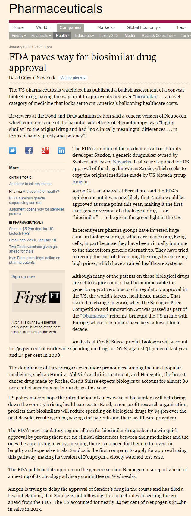 De concretarse la aprobación, Zarzio sería el primer biosimilar aprobado por el organismo regulador norteamericano. Según lo explica detalladamente el diario Financial Times. Ver artículo.