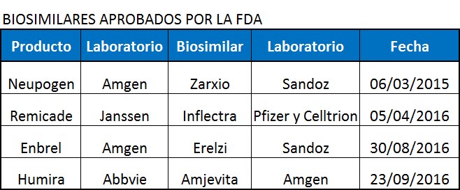 Hasta el momento, la FDA lleva aprobados cuatro biosimilares. Los primeros que dieron a luz fueron Zarxio de Sandoz -el biosimilar de Neupogen, creado por Amgen-, e Inflectra desarrollado en conjunto por Pfizer y Celltrion -que resulta el bioequivalente de Remicade de Janssen-.