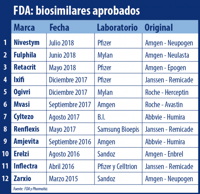 La FDA tiene ahora una docena de biosimilares aprobados. La norteamericana Pfizer recibió el OK para su producto Nivestym, una réplica de Neupogen, de la biotecnológica Amgen.