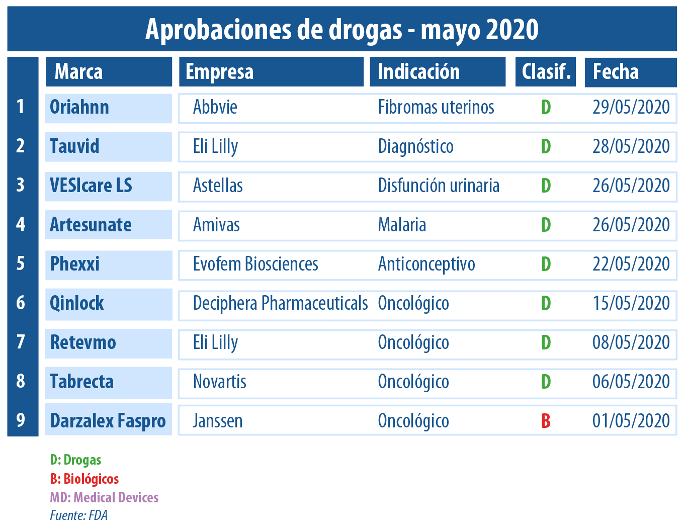 En este mayo marcado por la crisis del coronavirus, la FDA no frenó su ritmo de aprobaciones de productos extra COVID-19. Según el relevamiento propio realizado por Pharmabiz, se registraron al menos ocho avales de nuevos medicamentos.