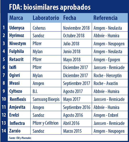 Asimismo, el nuevo producto consiguió el aval de la Comisión Europea que lleva la delantera con 48 biosimilares aprobados, mientras que la FDA va recién por los 14. Ver listado CE