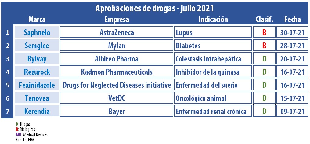 Otro producto que recibió la venia en este mes de julio fue Fexinidazole. El medicamento, que fue desarrollado por la ONG Drugs for Neglected Diseases Iniciative, en conjunto con la francesa Sanofi y otros partners africanos, ya había conseguido el visto bueno de la EMA en el 2018. La nueva molécula se constituyó en la primera terapia oral para la enfermedad del sueño, la cual es provocada por dos tipos de parásitos y trasmitida por la mosca tse-tsé, al igual que el Chagas. Ver Press Release Sanofi.