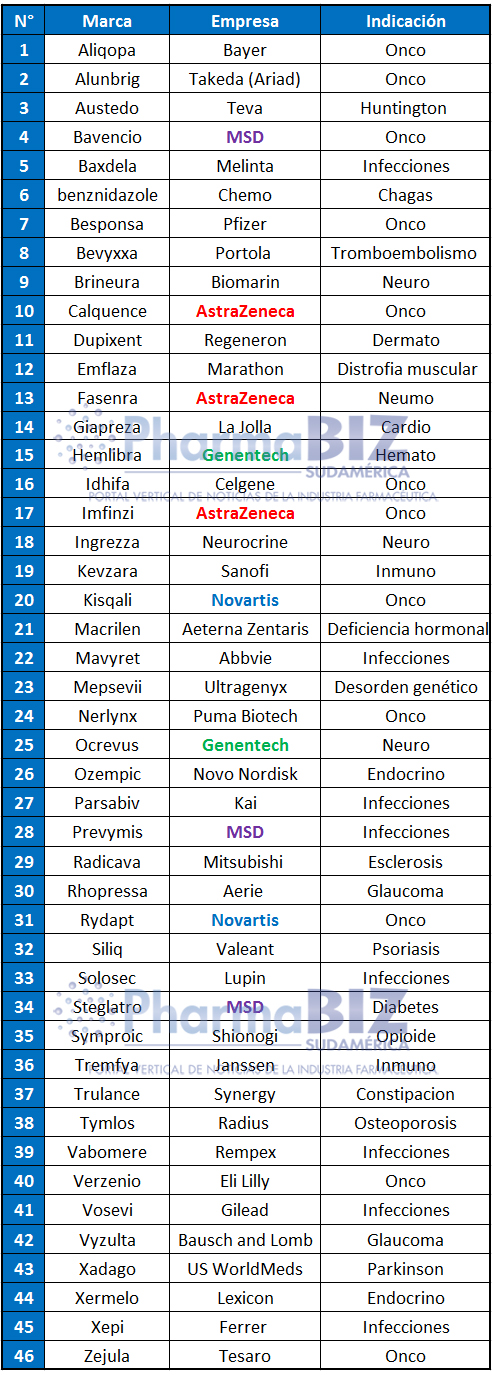 El año pasado, 18 de los 46 medicamentos nuevos recibieron el OK bajo la designación de drogas huérfanas, muchos de ellos son oncológicos. En el listado resaltan Aliqopa, de Bayer; Alunbrig, de Takeda; Bavencio, de Merck; y Besponsa, de Pfizer, entre otros.