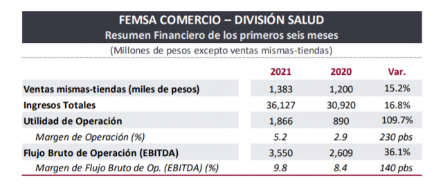 La facturación de la División Salud aumentó 16.8% a 36.127 millones de pesos mexicanos (u$s 1.818,2 millones). FEMSA dijo las «ventas mismas-tiendas» aumentaron en promedio 15.2%, reflejando tendencias positivas en las operaciones en México, Chile y Colombia, combinadas con un efecto cambiario favorable producto de la apreciación del peso chileno en relación con el peso mexicano durante los primeros seis meses del año.