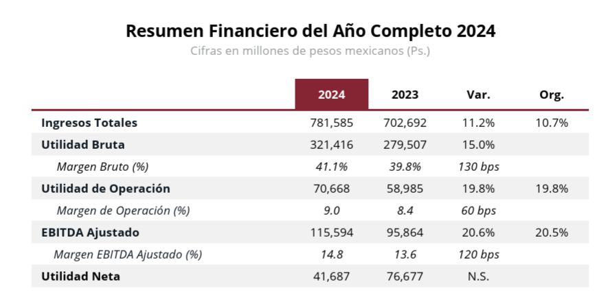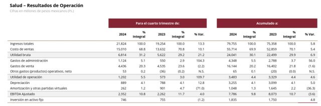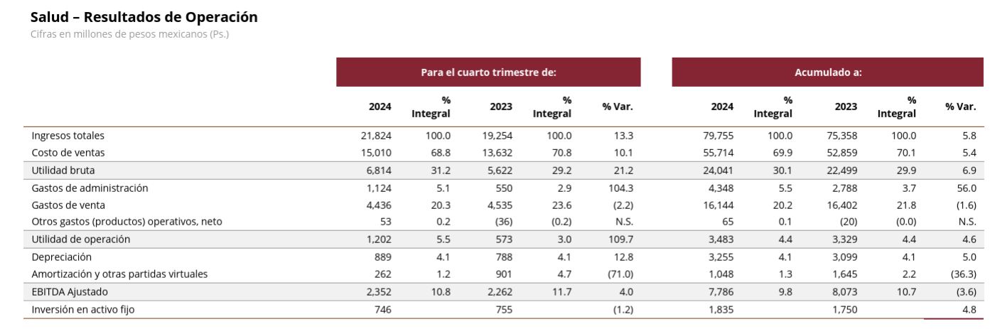 La División Salud fue la que presentó el menor crecimiento, al reportar una suba del 5,8% a 79.755 millones de pesos mexicanos (u$s 3.898,2 millones). Al 31 de diciembre de 2024, esta unidad contaba con 4.661 locales, un 4,2% por encima de los 4.474 que tenía a fines de 2023. De ellos, 2.922 se ubican en Sudamérica y 1.739 en México.