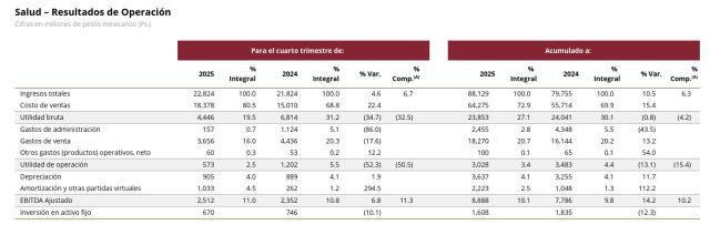 La División Salud presentó un crecimiento reportado de 6,3% a 88.129 millones de pesos mexicanos (u$s 3.111,1 millones). Al 31 de diciembre de 2025, esta unidad contaba con 4.503 locales, un -3,4% por debajo de los 4.661 que tenía a fines de 2024. De ellos, 3.186 se ubican en Sudamérica y 1.317 en México.