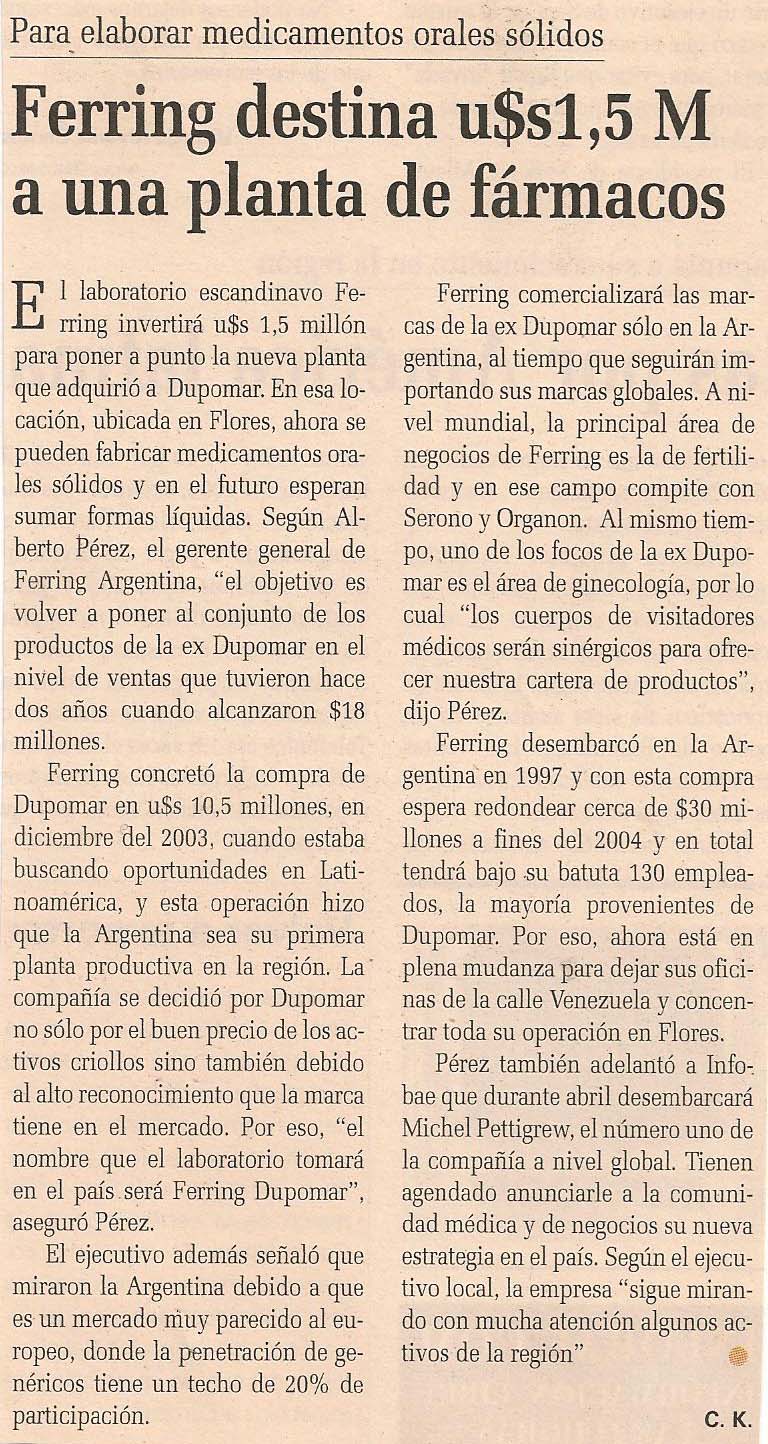 El laboratorio escandinavo Ferring invertirá u$s 1,5 millones para poner a punto la nueva planta que adquirió a Dupomar. En esa locación, ubicada en Flores, ahora se pueden fabricar medicamentos orales sólidos y en el futuro esperan sumar formas líquidas. Según Alberto Pérez, el gerente general de Ferring Argentina, «el objetivo es volver a poner al conjunto de los productos de la ex Dupomar en el nivel de ventas que tuvieron hace dos años cuando alcanzaron $18 millones.