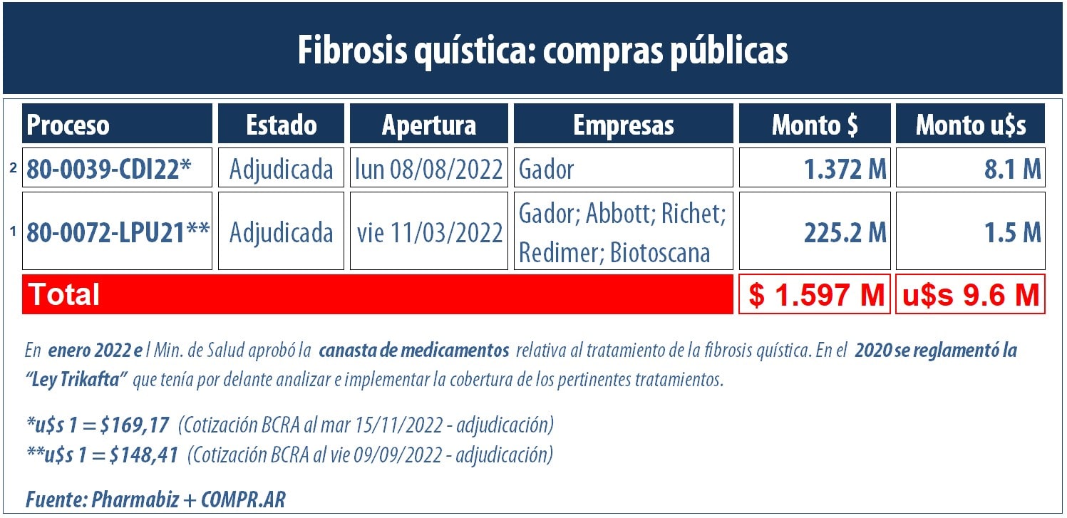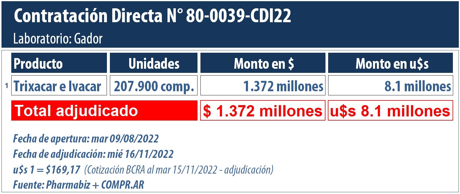 La empresa le proveerá al Estado de 2.310 envases, conteniendo cada uno 90 comprimidos, de los cuales 60 corresponderán a Trixacar, a base de elexacaftor, tezacaftor, e ivacaftor; y los 30 comprimidos restantes a Ivacar, ivacaftor 150mg. Por dichas unidades, Gador percibirá una suma de $1.372 millones (u$s 8.1 millones), luego de que la Dirección de Compras y Contrataciones le solicitara a la firma una mejora en su cotización, la que resultó un 6,11% por debajo del Precio Unitario de Referencia actualizado por la Comisión Asesora de Precios de Compra de Medicamentos e Insumos Sanitarios al mes de septiembre de 2022. Ver Contratación