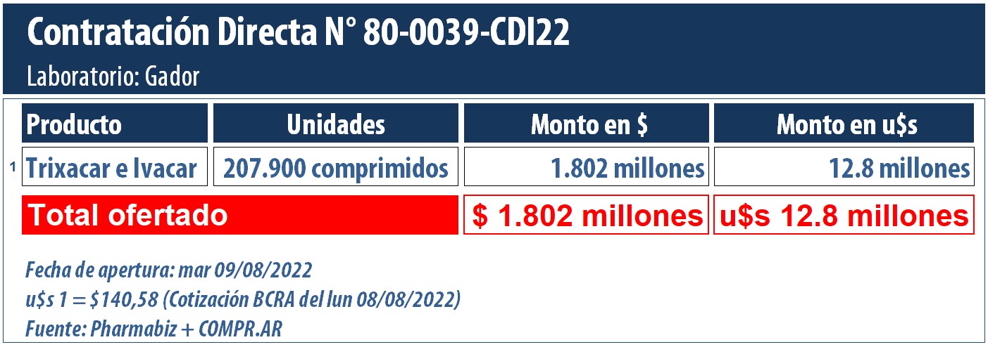 Hoy martes 9 de agosto, el Ministerio de Salud de la Nación reabrió una Contratación Directa por Exclusividad a fin de adquirir partidas de Trixacar e Ivacar, inmunomoduladores del nacional Gador e indicado para el tratamiento de la fibrosis quística. Ver Contratación