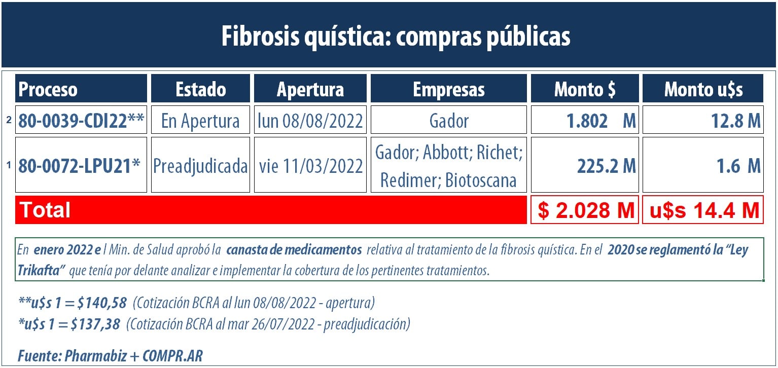 Las compras de medicamentos relativos a la fibrosis quística siguen en el centro de la agenda del Ministerio de Salud. A fines de julio, el Estado preadjudicó un proceso y ahora, reabrió una contratación apuntada a la adquisición de Trixacar e Ivacar, de Gador. Le podría implicar al Estado un desembolso de $1.802 millones (u$s 12.8 millones).