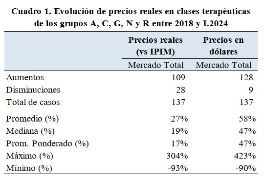 «Así, comparados con los aumentos del precio promedio ponderado del 26,5% (IPIM) y 57,8% en US$ corrientes que surgen de la Figura 2 considerando el sub-período 2018-I.2024, el cálculo por separado de los aumentos de los precios en cada clase terapéutica y su posterior agregación, como se hizo en el Cuadro 1, conduce,considerando el promedio ponderado de dichos aumentos según las participaciones iniciales de las ventas en cada clase terapéutica dentro del tota, a estimar un aumento agregado del precio algo menor», remarca el artículo.