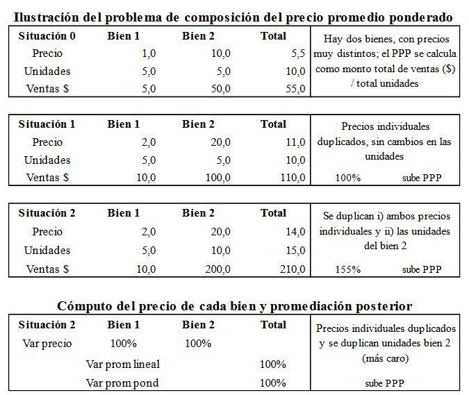 - Finalmente, si primero se calcula la variación de cada precio individual y luego se computa un promedio de estos cambios, tal sobreestimación no se verifica (último bloque).