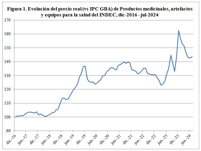 Sobre el primer aspecto, como se observa en la Figura 1, entre dic-2016 y jul-2024, el índice que mide INDEC “precio de los medicamentos, artefactos y equipos para la salud” mide 43% de aumento real vs. la inflación minorista medida por el IPC. «Sobre el segundo aspecto, continuamente hay menciones al respecto en los distintos medios informativos», añade.