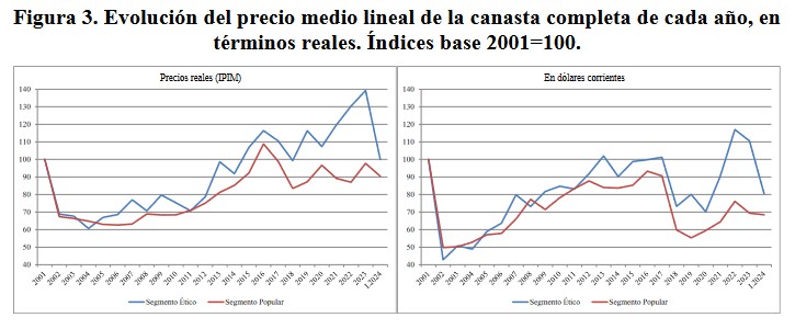 El trabajo presenta un ejercicio que permite una corrección parcial del problema, evitando sólo el efecto de cambios en la canasta de consumo, aunque sin excluir nuevos productos, consistente en computar la evolución del precio promedio lineal, sin ponderar por ventas, lo que equivale a ponderar por igual número de unidades los consumos de cada producto durante todo el período analizado, una “canasta completa” del período 2001-I.2024.5 «El resultado obtenido, presentado en la Figura 3, es que en el segmento ético, con peor comportamiento de precios respecto del segmento popular, los precios subieron 1% real (IPIM) y bajaron 20% en US$ corrientes, valores inferiores a los que surgieron de la Figura 2 anterior», detalla.