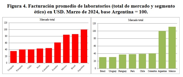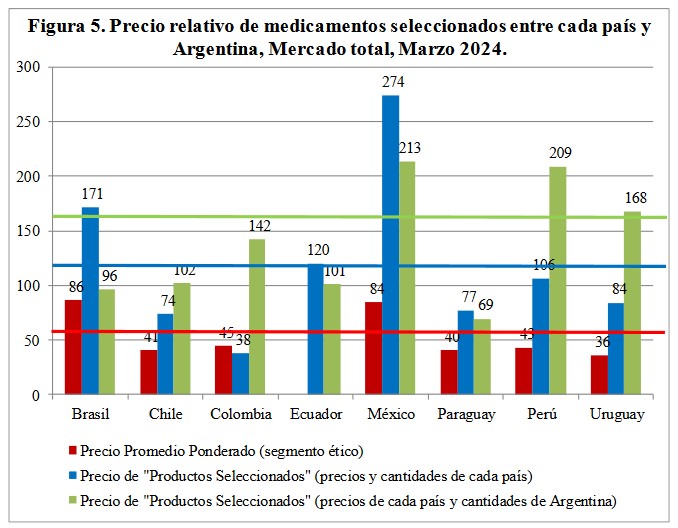 Sin embargo, los medicamentos que se venden en cada país son diferentes, y los tamaños de las cajas, cantidad de dosis y cantidad de principio activo por dosis, también lo son, y mucho. Por ello los datos de la Figura 4 son absolutamente engañosos. La Figura 5 presenta una comparación corregida en dos aspectos centrales. Primero, homogeneizando la presentación de los productos. Segundo, seleccionando igual canasta de productos en todos los casos.