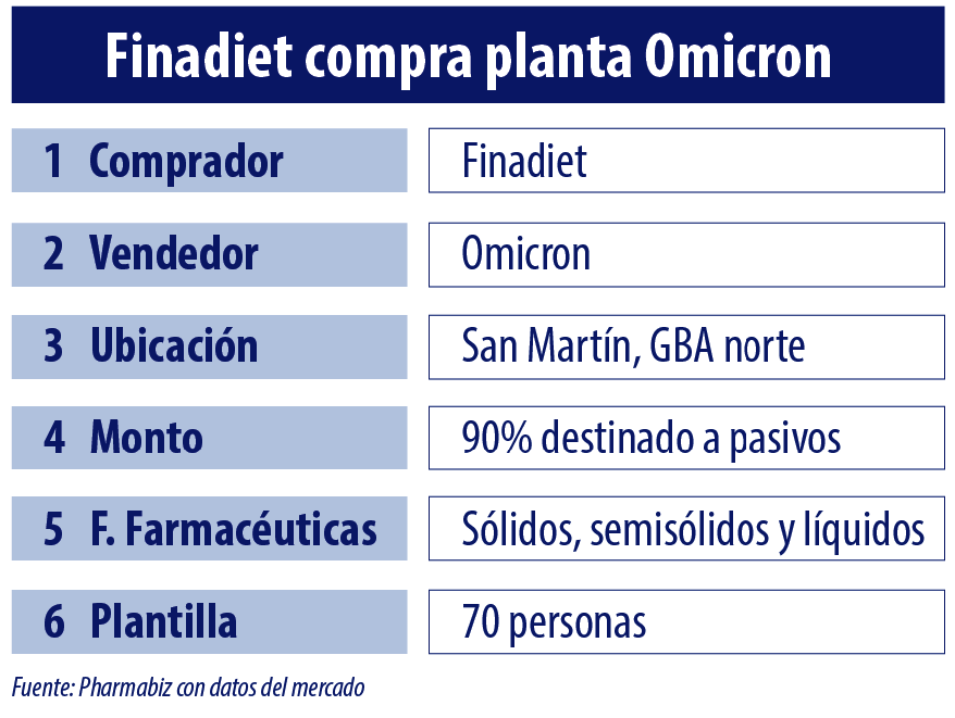 El laboratorio nacional Finadiet se hizo de la planta de manufactura de su par Omicron. La firma entró a la unidad de manufactura de San Martín, a través de un salvataje que cubrirá sus pasivos. El site está enfocado en sólidos, semisólidos y líquidos.
