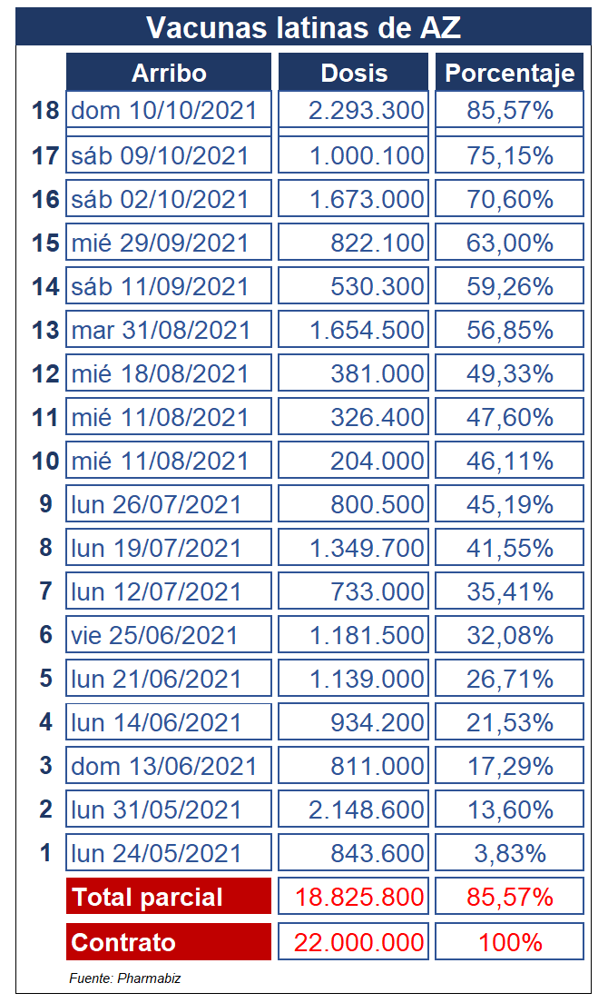 En el fin de semana en que los feriados dieron la nota llegaron a la Argentina vacunas latinas de AZ. Según informó el gobierno son más de 3.2 millones. Al momento se completa el 85.57% de lo comprometido en el contrato.