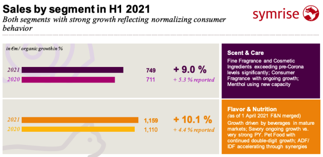 A partir del 1 de abril de 2021, Symrise modificó la forma en que segmenta sus negocios. Desde entonces, presenta información agrupada en dos unidades: Scent & Care y Flavor & Nutrition.