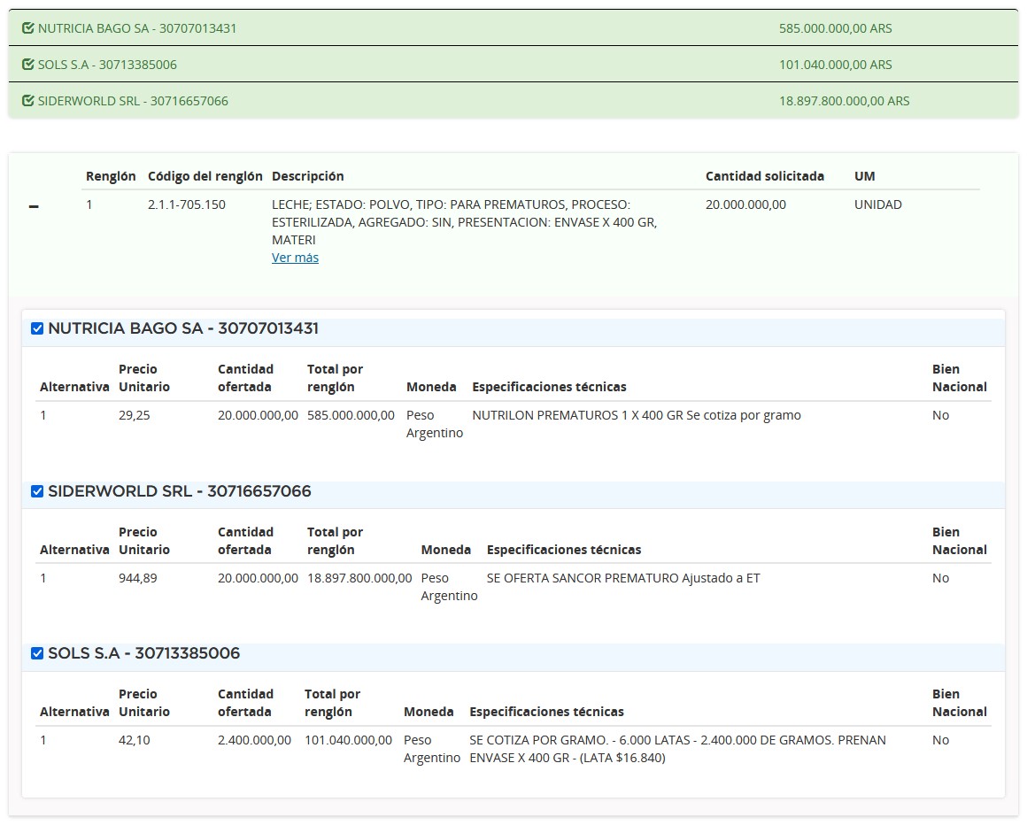 Además figura la nacional Siderworld, una empresa que tiene experiencia en compras públicas avocadas al mantenimiento, reparación y limpieza de maquinaria, y que también se dedica a la comercialización de un amplio abanico de productos. Su oferta fue por el total del renglón, y con la marca Sancor Bebé, pero con un precio unitario más de diez veces mayor a los anteriores. Es así que cotizó $18.897 millones (u$s 17,1 millones) por las 20 toneladas de fórmula.