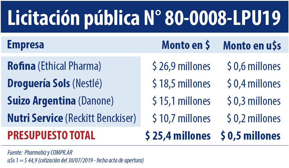 Por caso, el principal cotizante es la distribuidora Rofina, que levantó la mano en nombre del grupo Roemmers, con su negocio Ethical Pharma. Allí compite con su marca NutriBaby por un monto de $26.9 millones (u$s 601.5 mil).