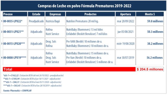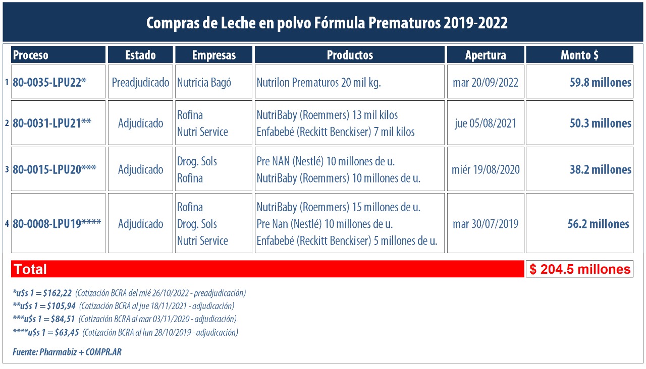 Nutricia Bagó, del grupo francés Danone continúa en carrera a fin de proveerle al Estado de 20 toneladas de leche en polvo para prematuros. La compañía resultó preadjudicataria por una suma total de $59.8 millones (u$s 368.6 mil).