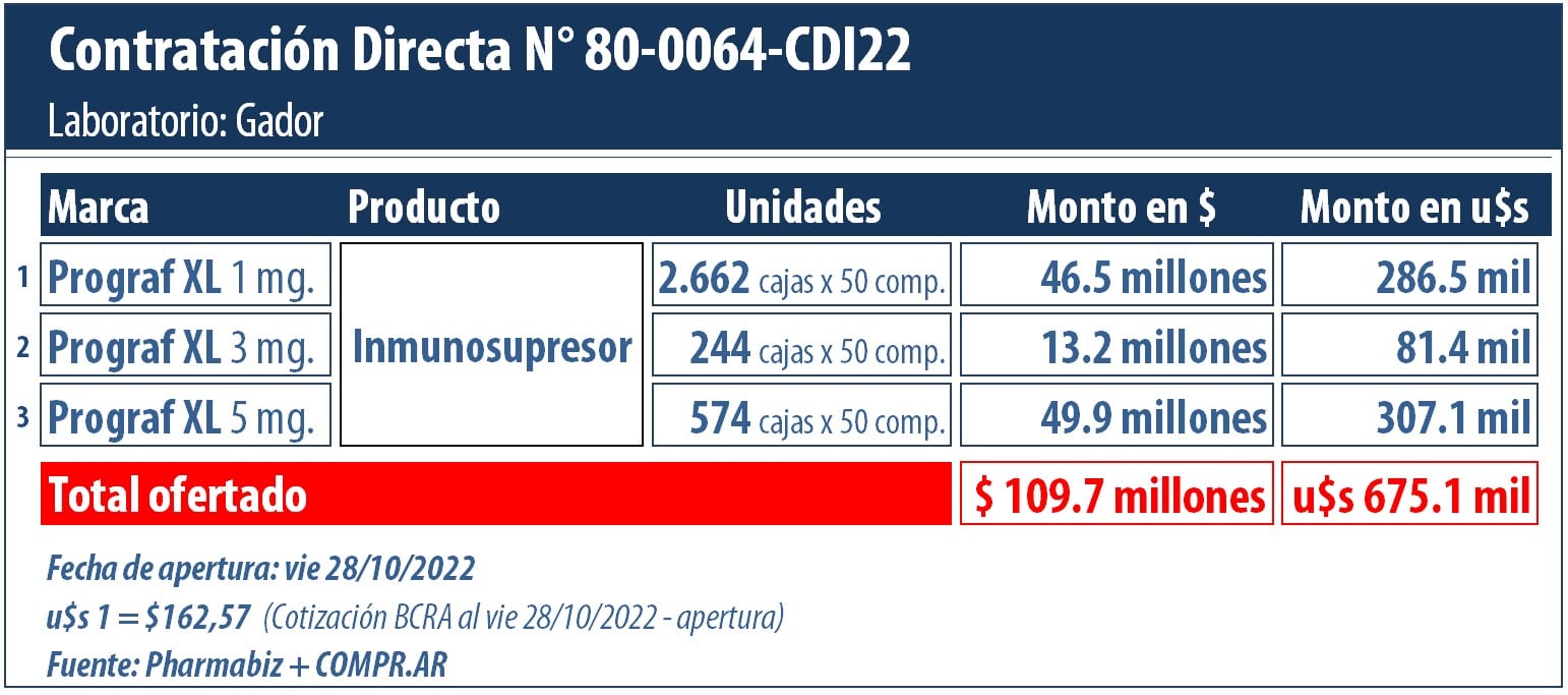 El laboratorio nacional Gador está en carrera a fin de proveerle al Estado partidas de su inmunosupresor Prograf XL por un total de $109.7 millones (u$s 675.1 mil). Todo en el marco de una Contratación Directa por Exclusividad.