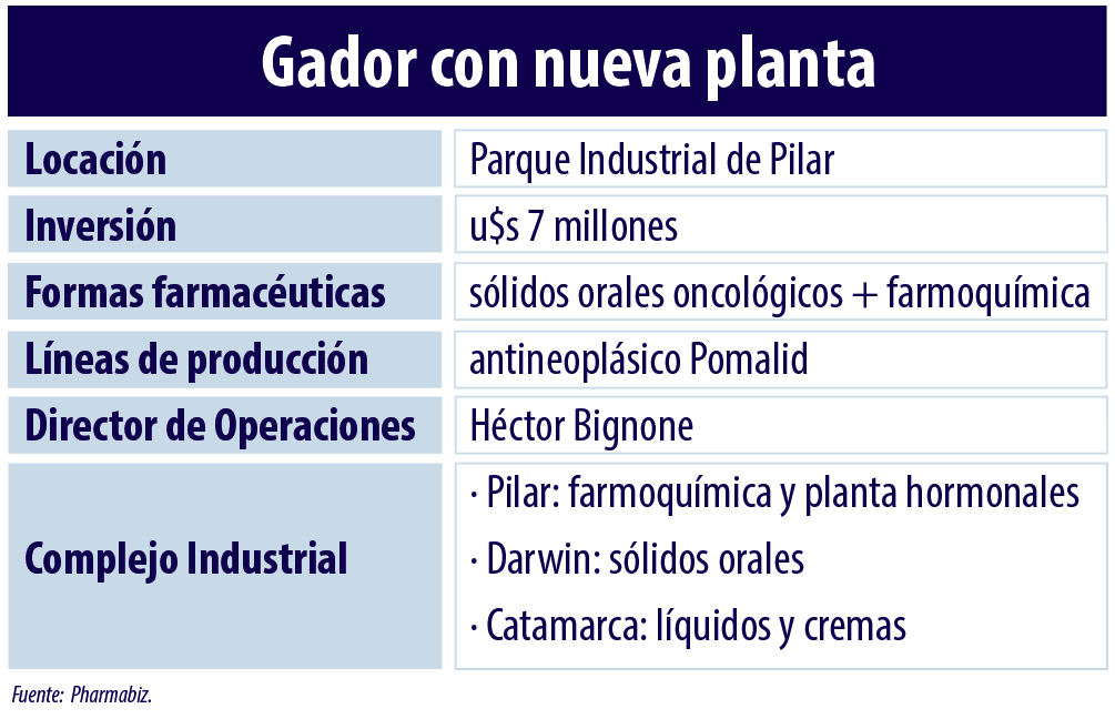 Gador cuenta además con varios brazos productivos. Bajo el mando de su director de Operaciones, Héctor Bignone, se suma la planta farmoquímica de Pilar y la más nueva de hormonales. También sigue firme con su site porteño ubicado sobre la calle Darwin, donde elabora sólidos orales. Por último opera en Catamarca con su planta enfocada en la fabricación de pastas dentales.