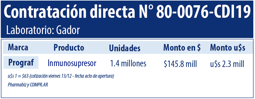 La compañía que se postuló a tales efectos fue el laboratorio nacional Gador, el que podría computar un total de $145.8 millones (u$s 2.3 millones) por la venta de 1.4 millones de unidades de su marca Prograf, a base de tacrolimus. Ver contratación.