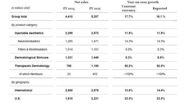 Desde una perspectiva geográfica, la facturación en mercados internacionales avanzó 14,4% interanual a u$s 2,976 millones. En tanto, las ventas netas en Estados Unidos ascendieron 23,3% a u$s 2.231 millones. Para el año fiscal 2026, Galderma espera otro año record, con un crecimiento en ventas de entre el 17% y el 20% en moneda constante.